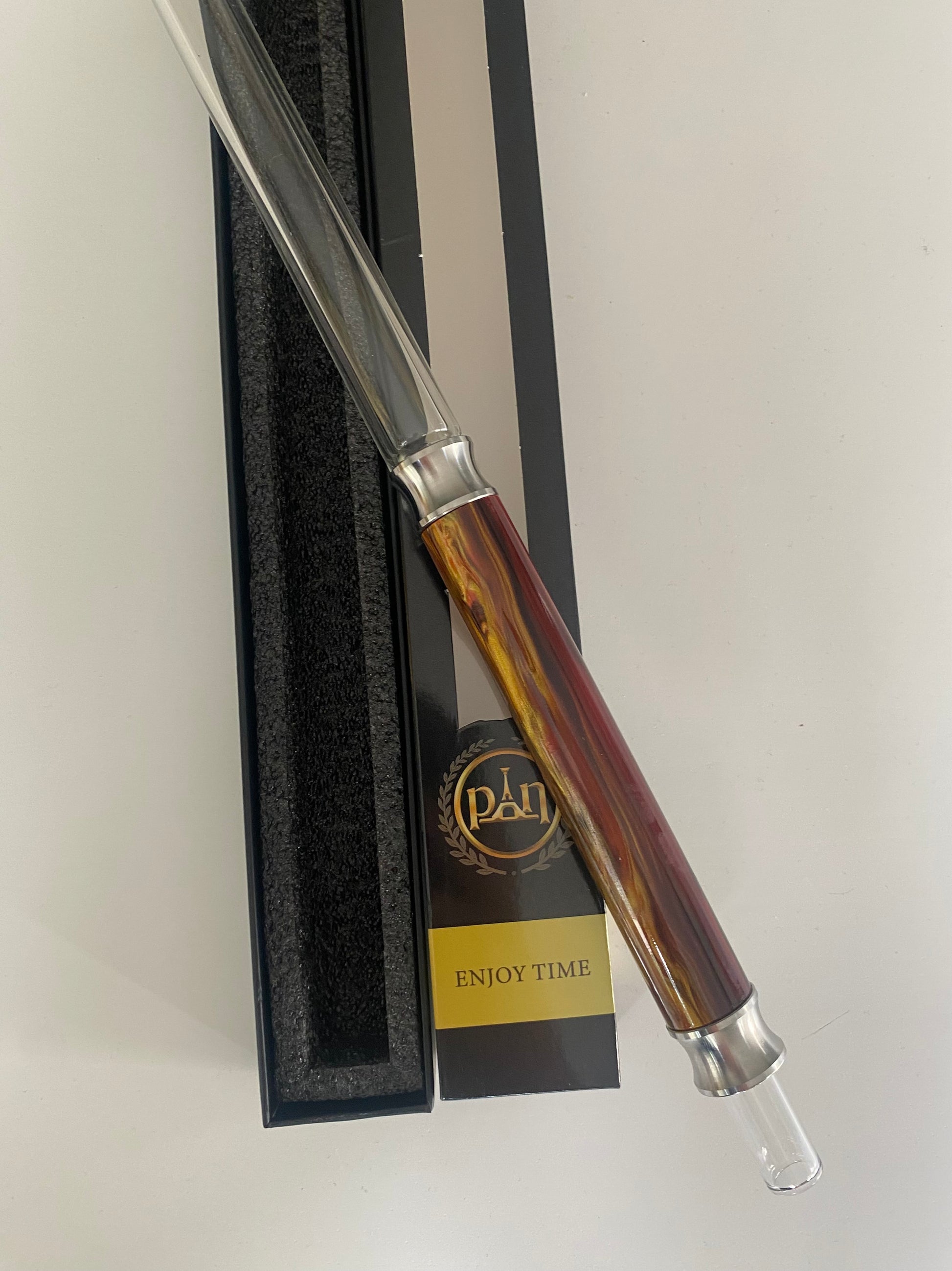 Découvrez ce somptueux manche Pan! Composé pour l'embout buccal de verre, la prise en main est quant à elle composée de résine ! L'alliage de ces deux matériaux compose un ensemble à l'esthétisme très réussi.
